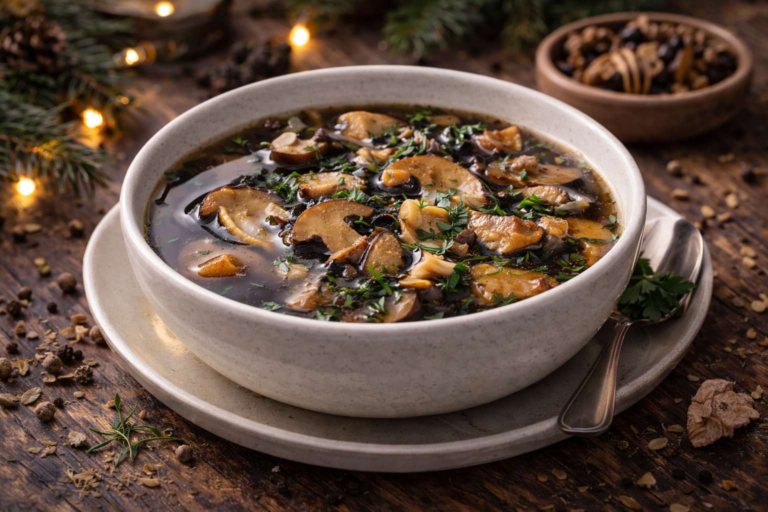 Juste après le barszcz, la soupe aux champignons est la deuxième soupe de Noël la plus populaire en Pologne. Elle est cuisinée à partir de champignons forestiers séchés, principalement des cèpes, et servie avec des pâtes ou des petites nouilles. Son parfum intense évoque immédiatement l’hiver et les fêtes, et elle est souvent proposée comme alternative ou complément au barszcz.